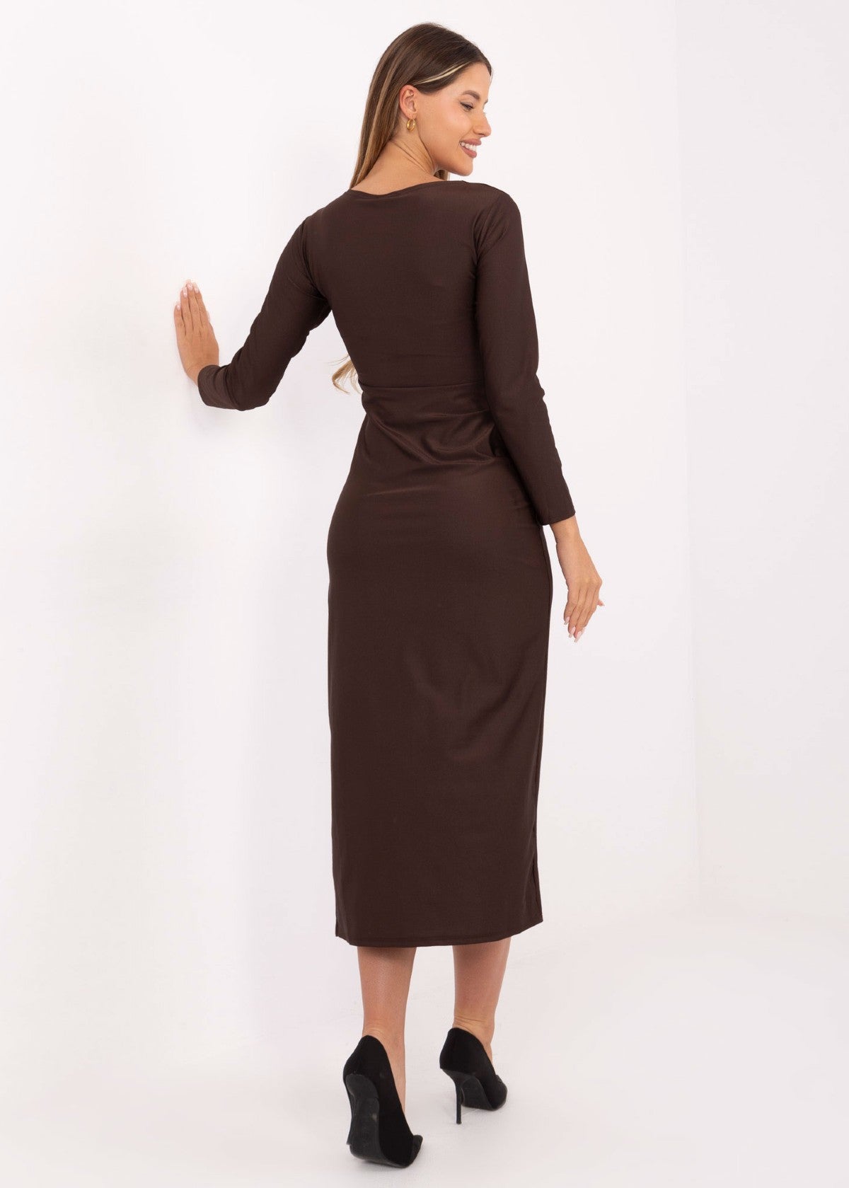 Elastīga auduma pieguļoša kleita ar dekoratīvu sprādzi, asimetrisks piegriezums, sānā šķēlums.