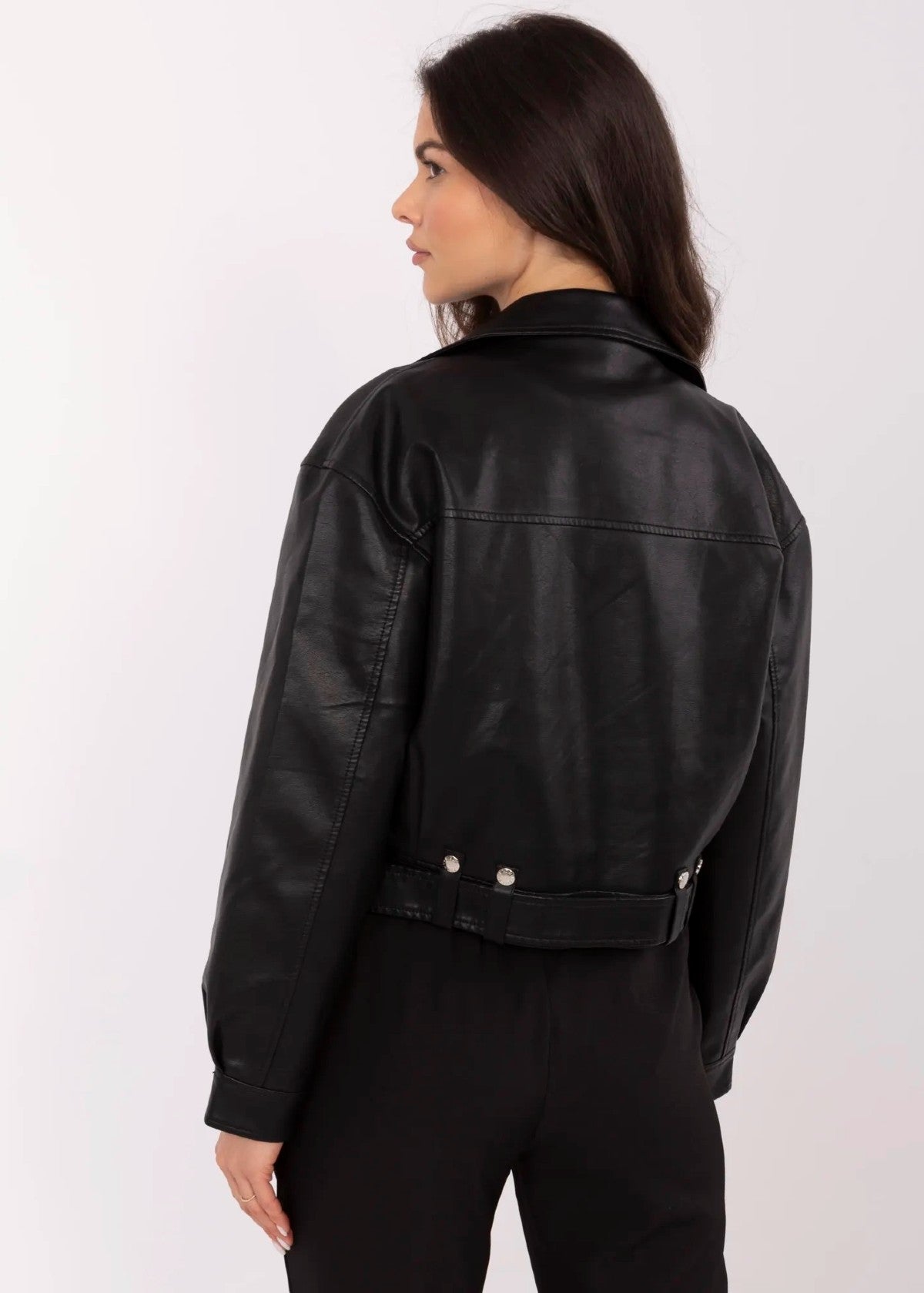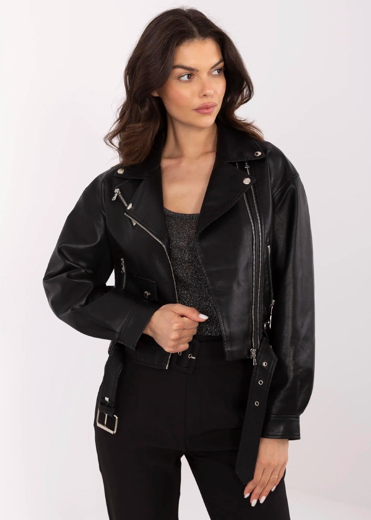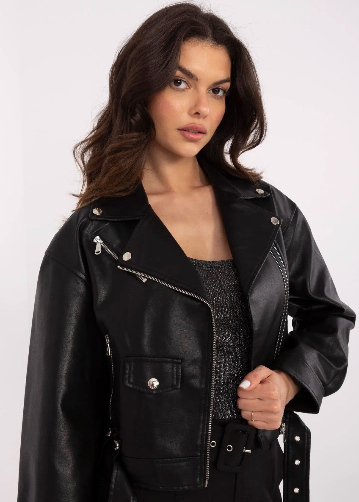 Melna mākslīgās ādas jaka ar jostu.