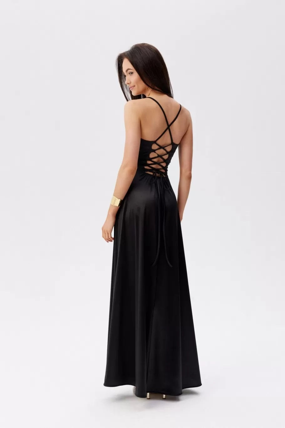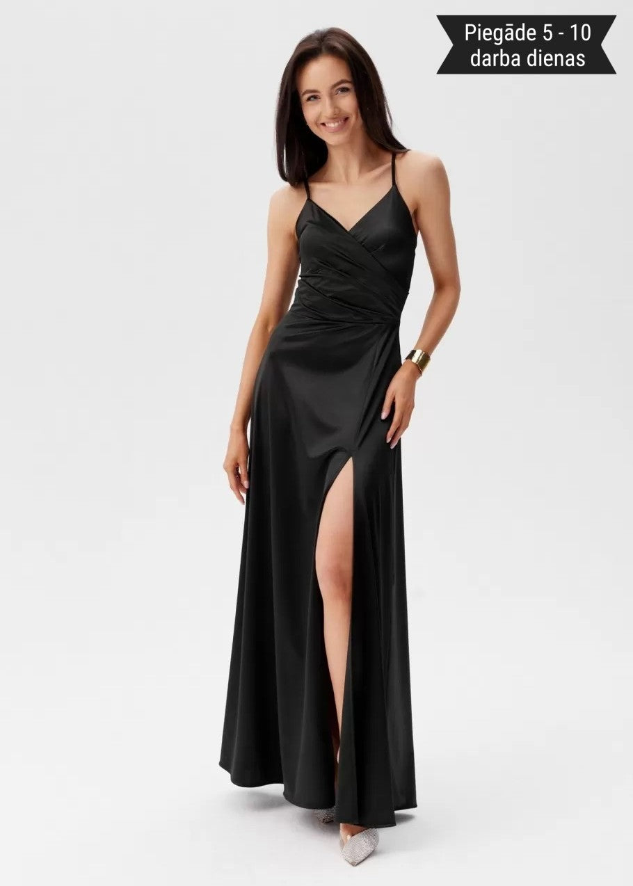 Gara spīdīga satīna auduma vakarkleita ar šķēlumu un šņorējamu muguru.