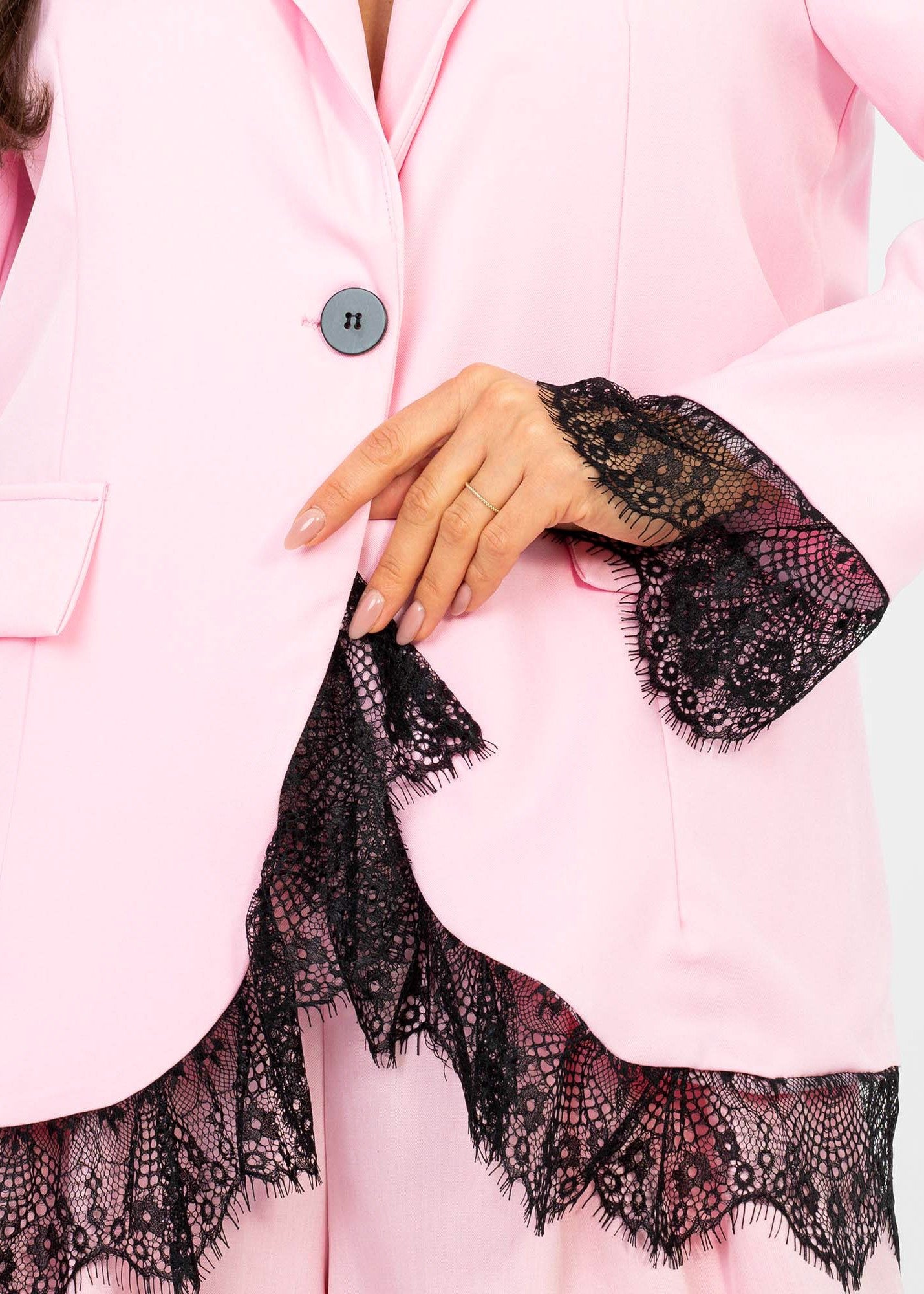 Žakete ar mežģīņu apakšmalu, ar oderi, plecu daļā iestrādāti polsteri.