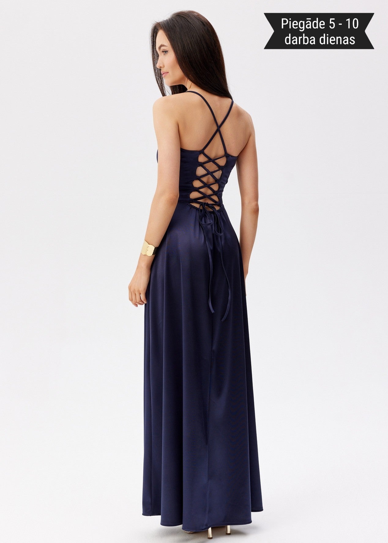 Gara spīdīga satīna auduma vakarkleita ar šķēlumu un šņorējamu muguru.